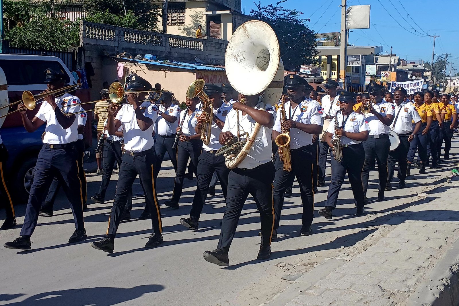 Dès les premières heures du matin, les élèves des cycles fondamental et secondaire se sont rassemblés dans la cour principale de l’établissement, sous un soleil ardent. Au centre de l’animation, la fanfare de la Police nationale, vêtue de blanc, a interprété la Dessalinienne ainsi que l’Hymne à la jeunesse, lançant officiellement les festivités. Autour d’eux, des policiers de l’unité EDUPOL, en uniforme, dispensaient conseils et rappels de civisme, invitant les élèves à incarner les bonnes pratiques indispensables à une société plus stable.