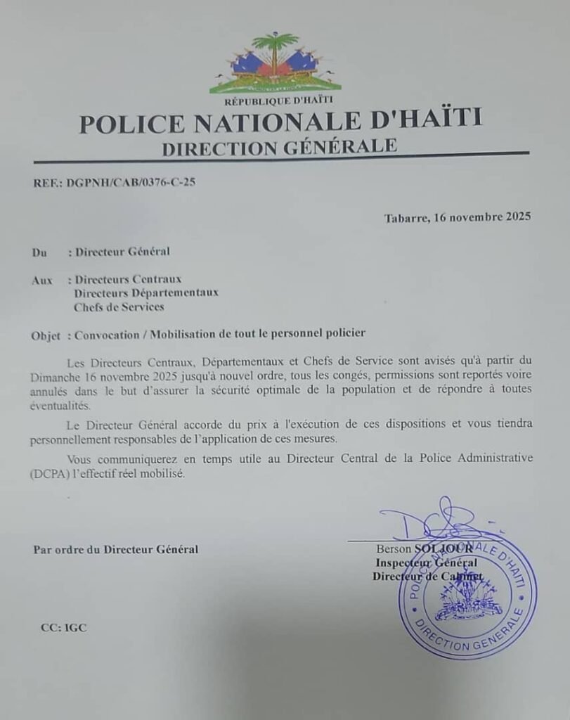 Tabarre, 16 novembre 2025 — La Direction Générale de la Police Nationale d’Haïti (PNH) a publié ce dimanche une note officielle annonçant la convocation et la mobilisation immédiate de l’ensemble du personnel policier sur tout le territoire national.