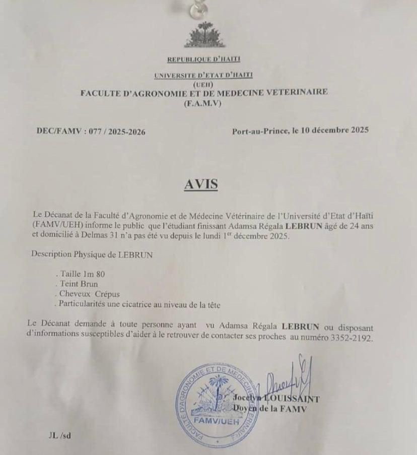 L’inquiétude grandit au sein de la communauté universitaire haïtienne. Dans un avis officiel daté du 10 décembre 2025, le décanat de la Faculté d’Agronomie et de Médecine Vétérinaire (FAMV) de l’Université d’État d’Haïti (UEH) a annoncé la disparition d’un de ses étudiants finissants, Adamsa Régala Lebrun, âgé de 24 ans. Selon le document, le jeune homme, domicilié à Delmas 31, n’a plus été vu depuis le lundi 1er décembre 2025.